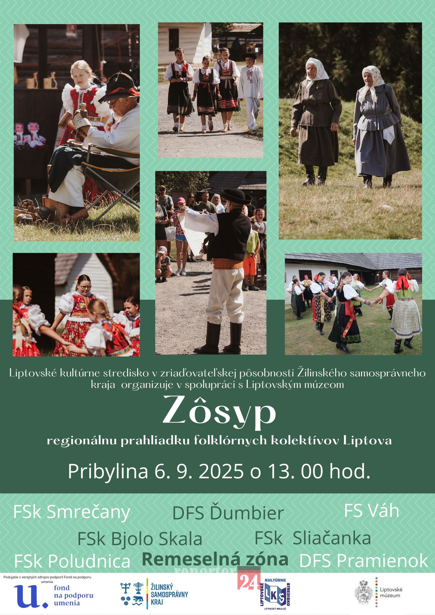 Na regionálnej prehliadke folklórnych kolektívov Liptova sa predstavia FSk Sliačanka z Liptovských Sliačov, FSk Poludnica zo Závažnej Poruby, FS Váh, DFS Pramienok a DFS Ďumbier z Liptovského Mikuláša, FSk Smrečany a FSk Bjolo Skala z Borového.