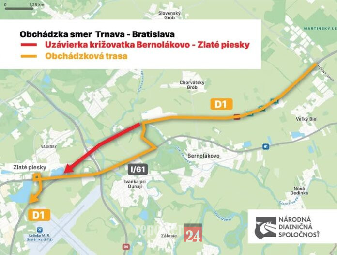 Upozorňujeme vodičov, že v sobotu (29.11.2025) v čase o 10:00 hod. dôjde k uzavretiu diaľnice D1 v smere do Bratislavy a to v úseku od križovatky „Bernolákovo“ po križovatku „Zlaté Piesky“.