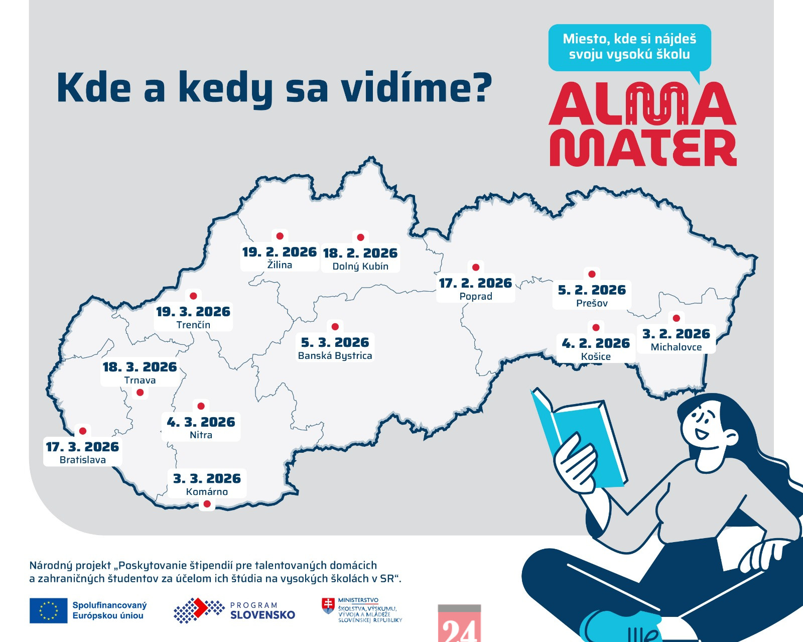Viac informácií o miestach a termínoch tu: https://www.minedu.sk/veltrh-vysokych-skol-alma-mater/. Vstup na veľtrhy je bezplatný. Školské skupiny sa prihlasujú na konkrétny čas prostredníctvom registračného formulára, jednotlivci a verejnosť môžu svoju účasť potvrdiť e-mailom na adrese almamater@minedu.sk. Odporúčame registráciu vopred, aby bol zabezpečený plynulý priebeh podujatia.