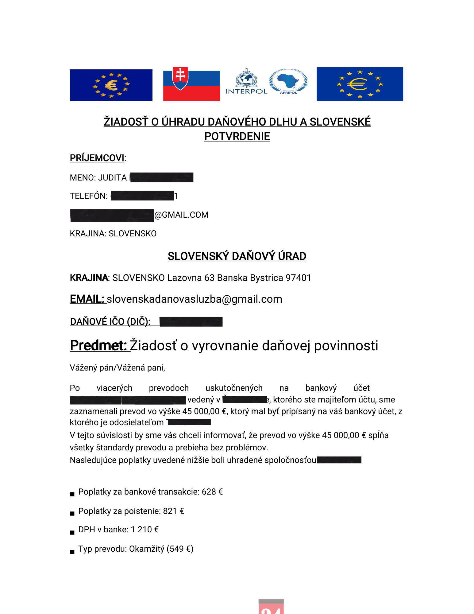 Podvodníci zasielajú falošné „žiadosti o úhradu daňového dlhu“ alebo „potvrdenia“ o prevodoch finančných prostriedkov, neraz aj s hlavičkami zahraničných inštitúcií (napr. INTERPOL alebo AFRIPOL). Uvádzajú tiež konkrétne identifikačné údaje subjektu (názov firmy, IČO, meno zodpovednej osoby, telefónne číslo), aby pôsobili dôveryhodne. V niektorých prípadoch zasielajú aj falošné „potvrdenia“ o prevodoch finančných prostriedkov alebo žiadajú úhradu poplatkov za „reaktiváciu prevodu“, „kolky“ či údajnú daňovú povinnosť v krátkej lehote (napr. do 24 hodín), pričom sa vyhrážajú zablokovaním bankového účtu alebo platobnej karty.